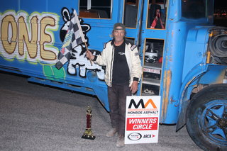The School Bus Figure 8 show saw AJ Padgett get up on 2 wheels several times, and Terry Smith did roll his bus, much to the delight of the roaring crowd. Through it all, Safari Sam Mills sped to the win. Dave Lambert, Jack Franzil, Joe Koester, Smith, Padgett and Dennis Whisman were the other bus drivers.