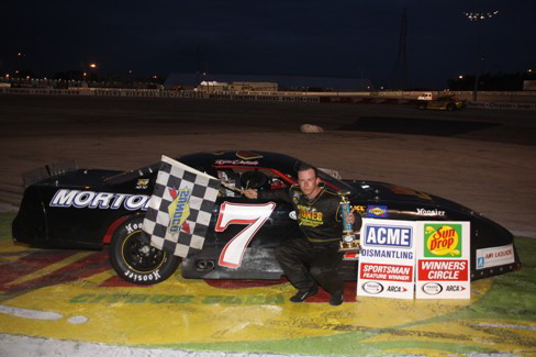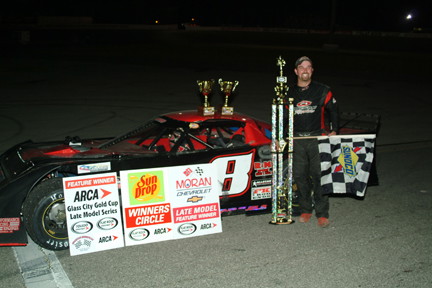 TOLEDO, OH (8-15-2008)-- Make it 2 in a row for former champ Howard Kelley Jr. at Toledo Speedway as he scored the win in the 35 lap ARCA National City Bank Sportsman main event on Allen Chevrolet-Cadillac/Qualite Sports Lighting Night. Tom Allen of Allen Chevy presented trophies to the winners, which also included Dennis Whisman, Josh Bunting and Dennis Futrel making trips to the New Glass Bowl Lanes Winner’s Circle.